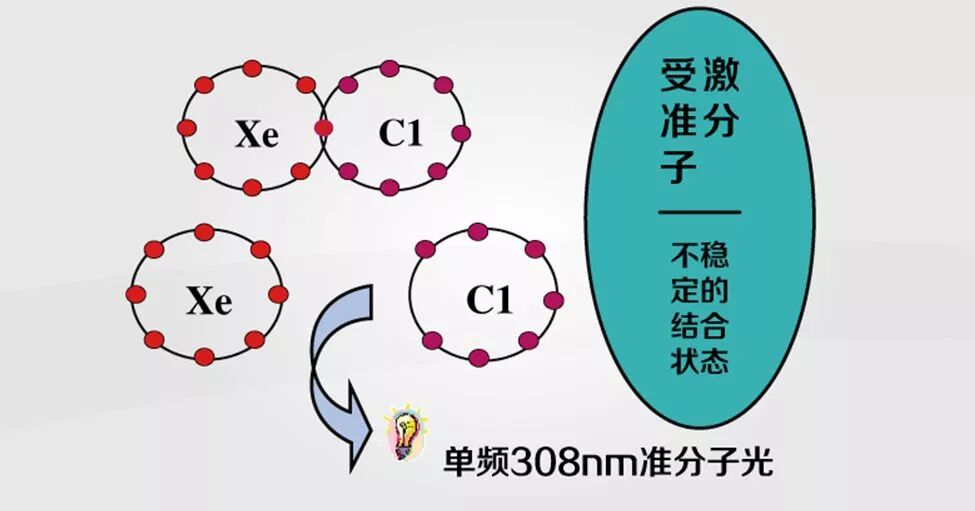 它可以發射308nm氙氯(XeCl)準分子光,Xecl二聚體由惰性氣體氙(最外層由8個電子)和鹵素氯(最外層有7個電子)組成。